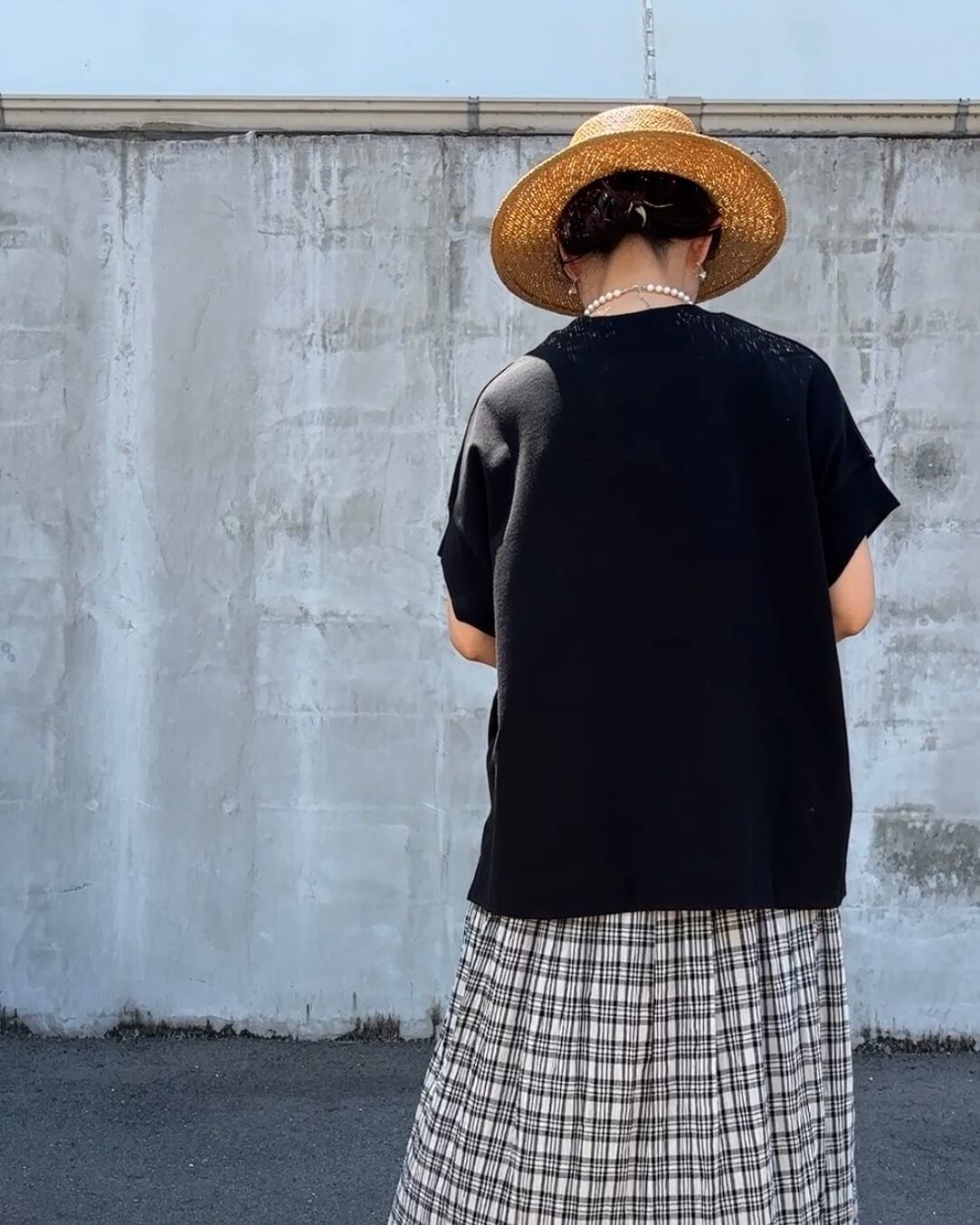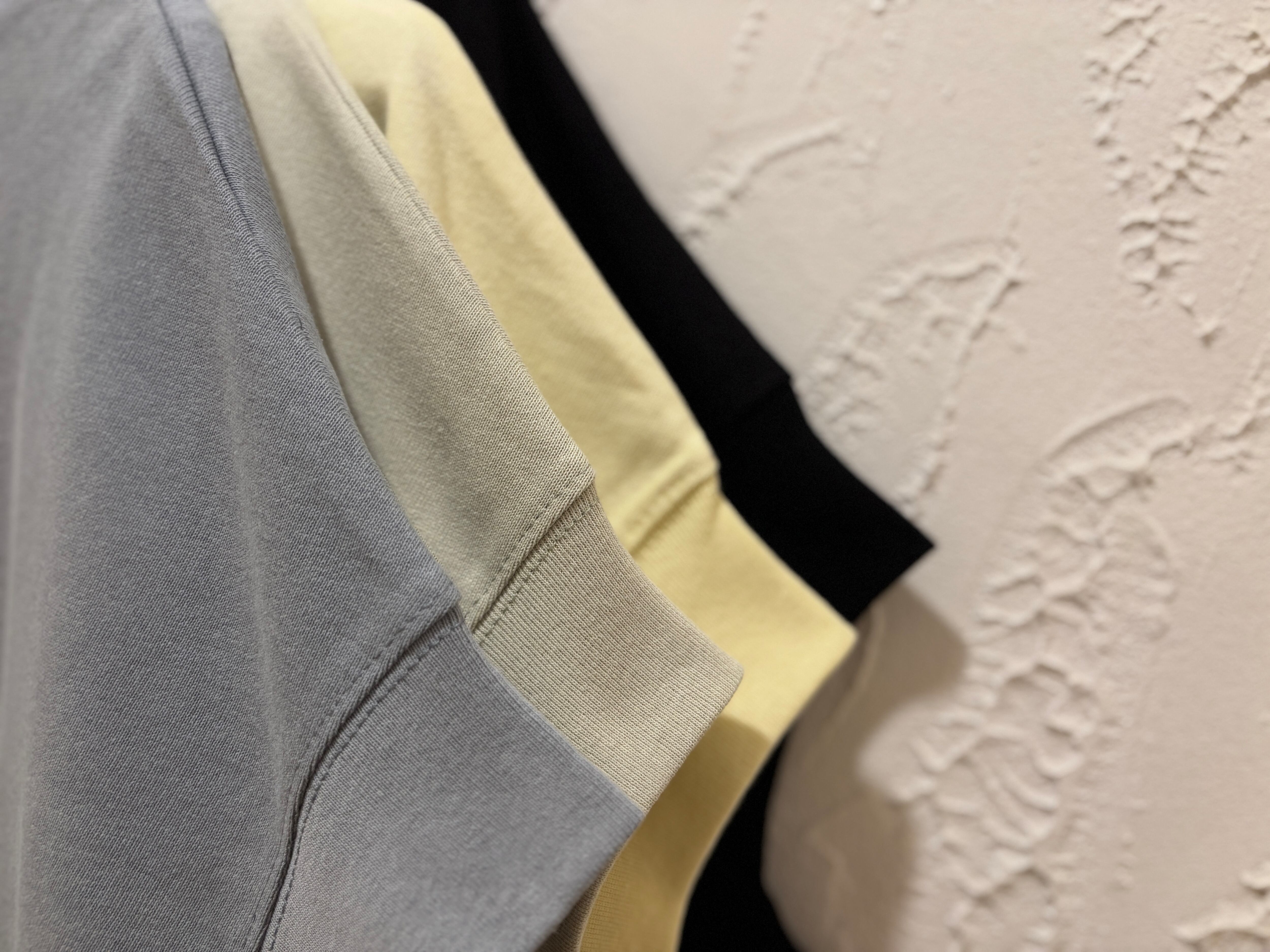 身体のラインを拾わないゆとりのあるシルエットと、ドロップショルダーのデザインがリラックス感を演出します。