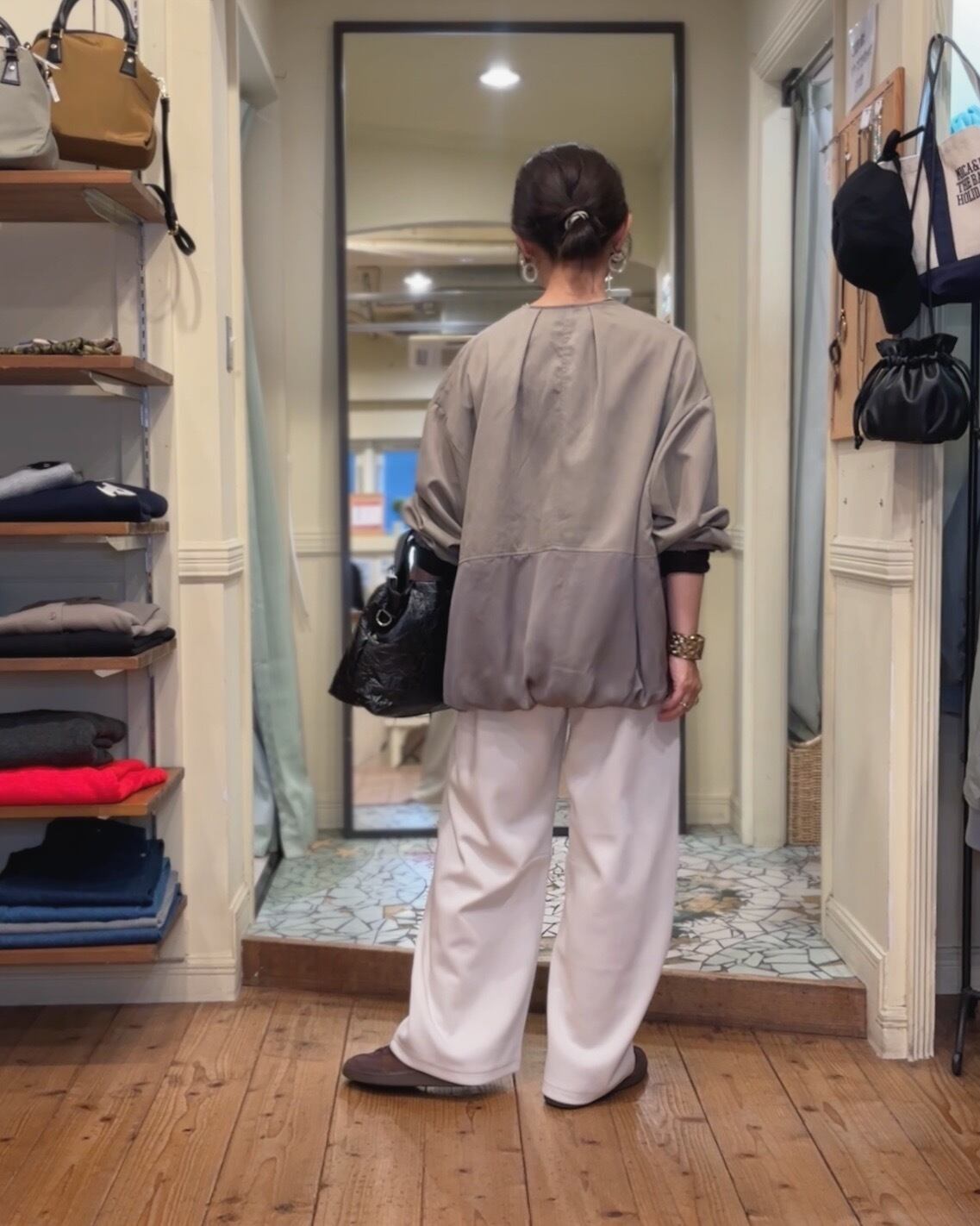 裾の異素材切替が腰位置を高く見せてくれ、スタイルアップ効果も◎