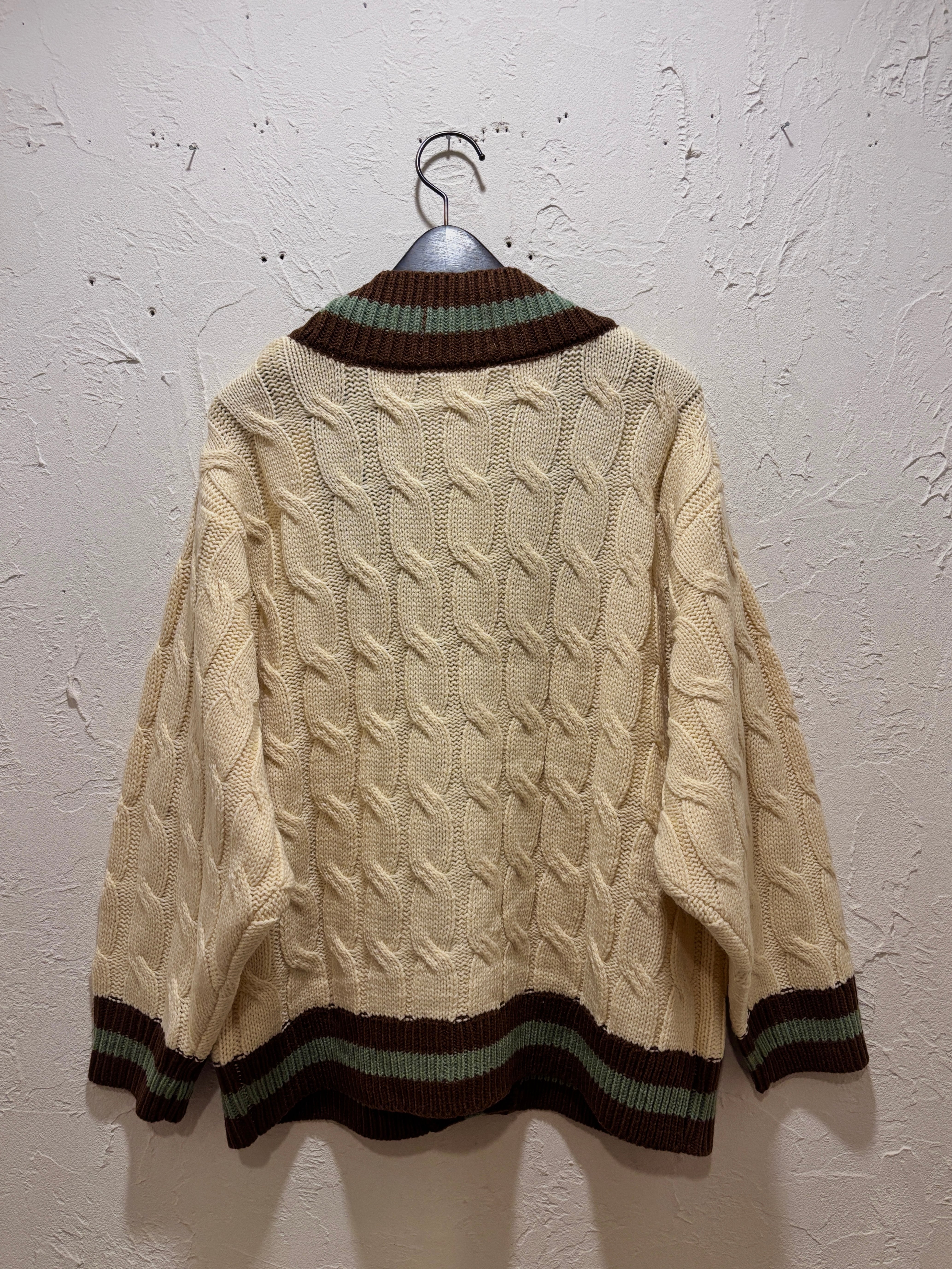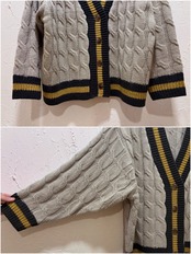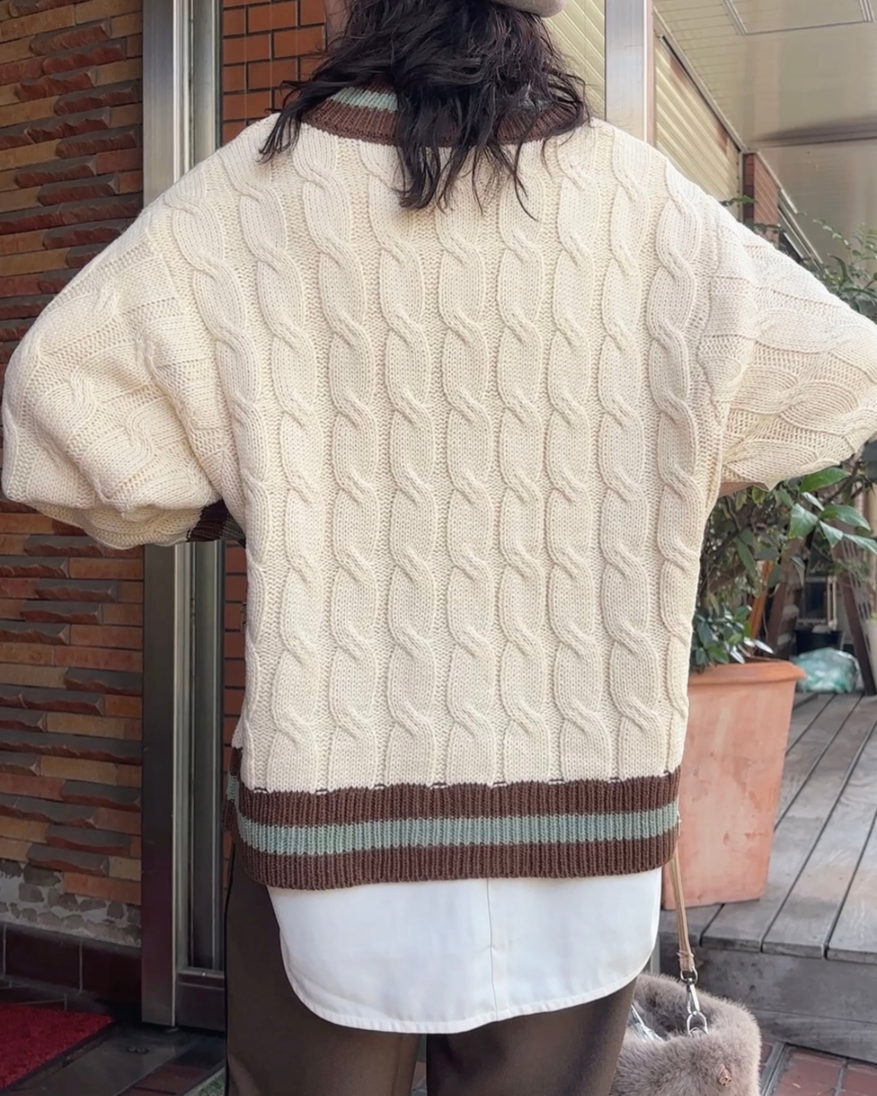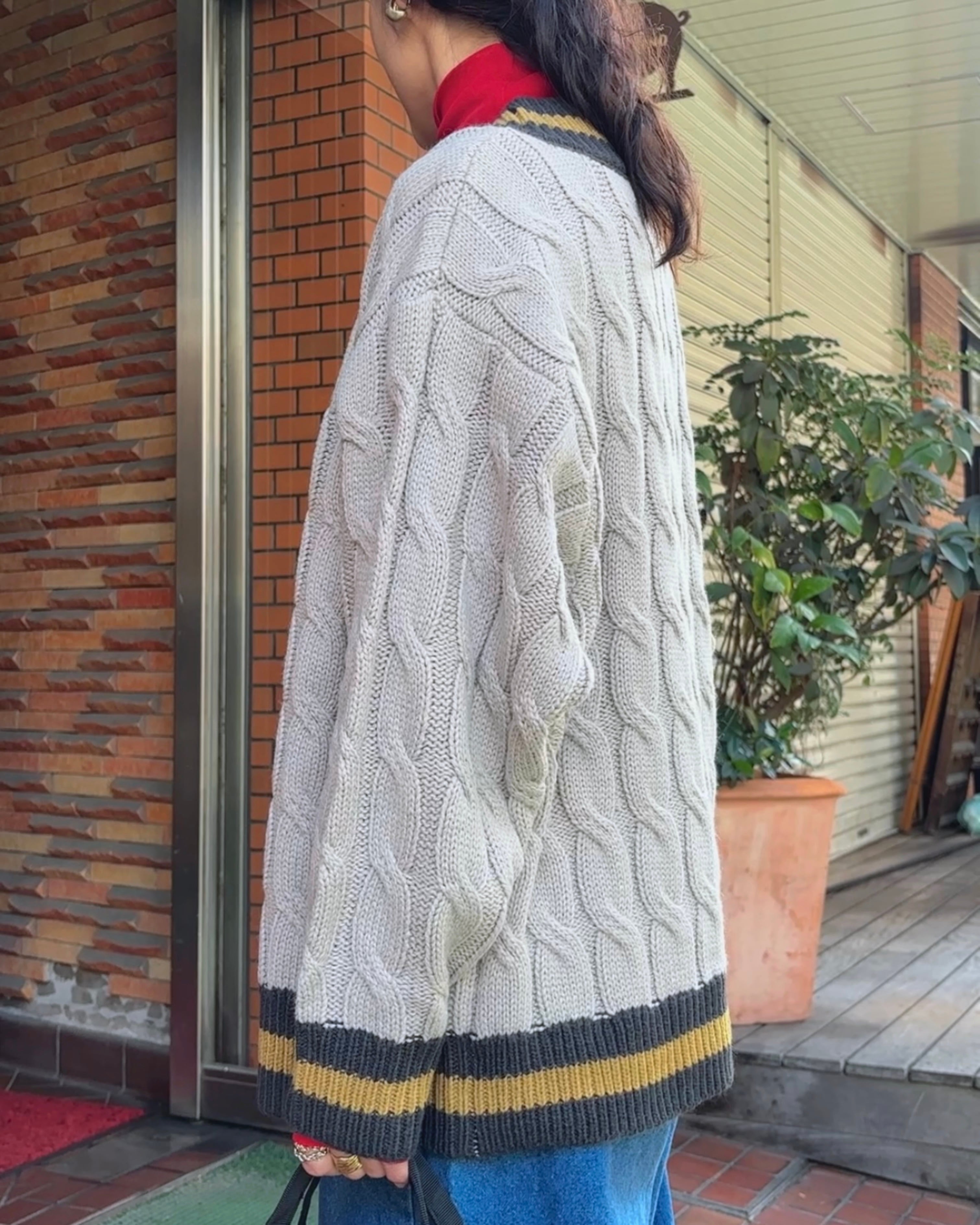 立体感のあるケーブル編みに、配色リブがアクセントになった存在感のあるカーディガン。