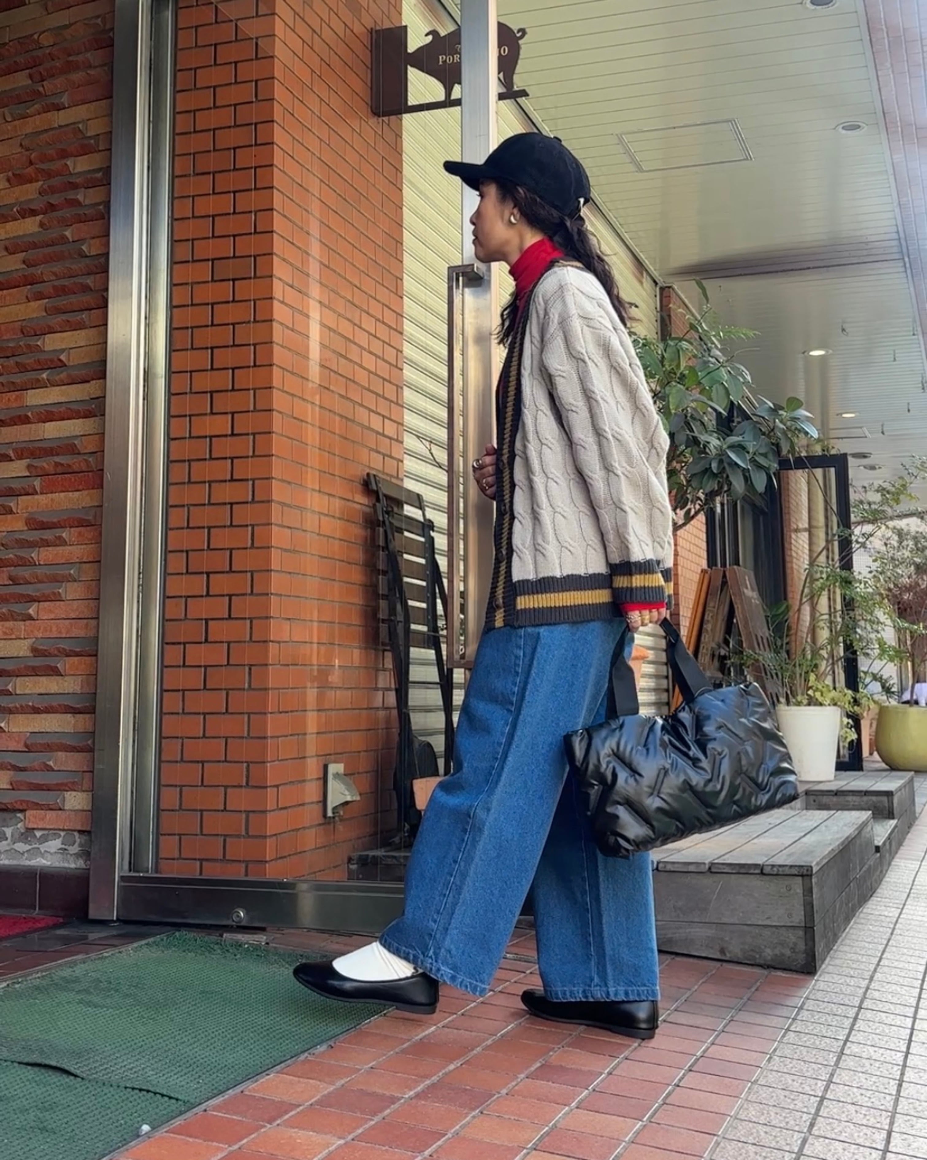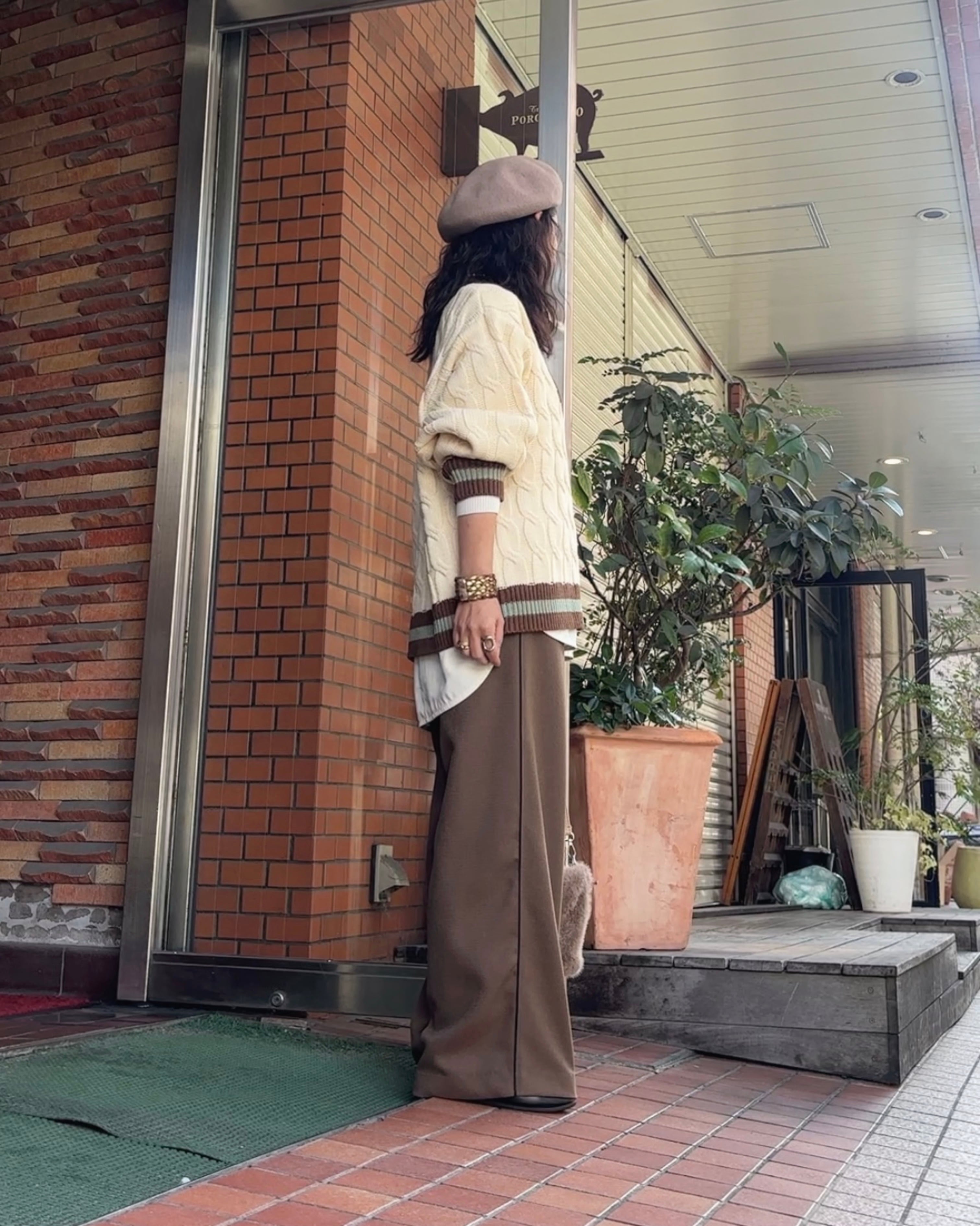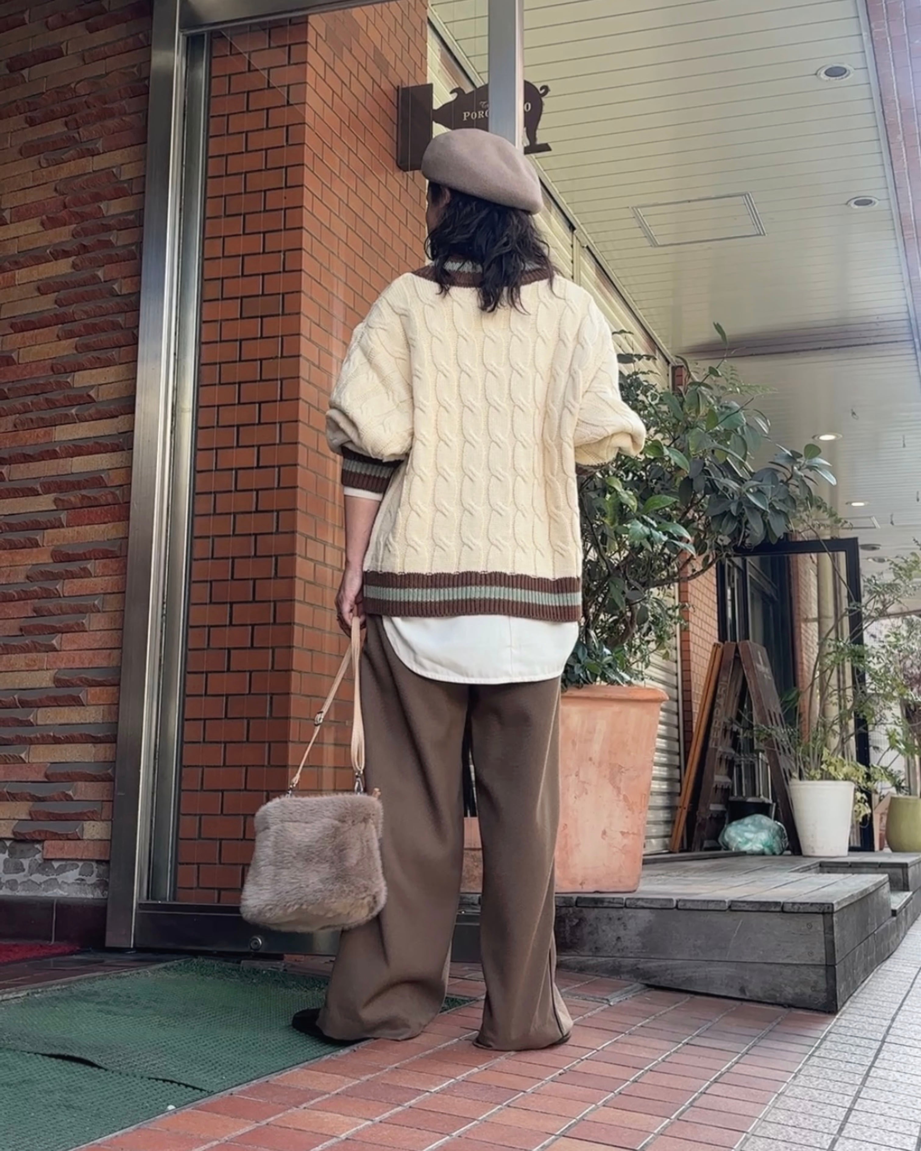 ややゆったりとしたシルエットで、インナーにシャツやタートルを重ねてもバランスよくまとまります。