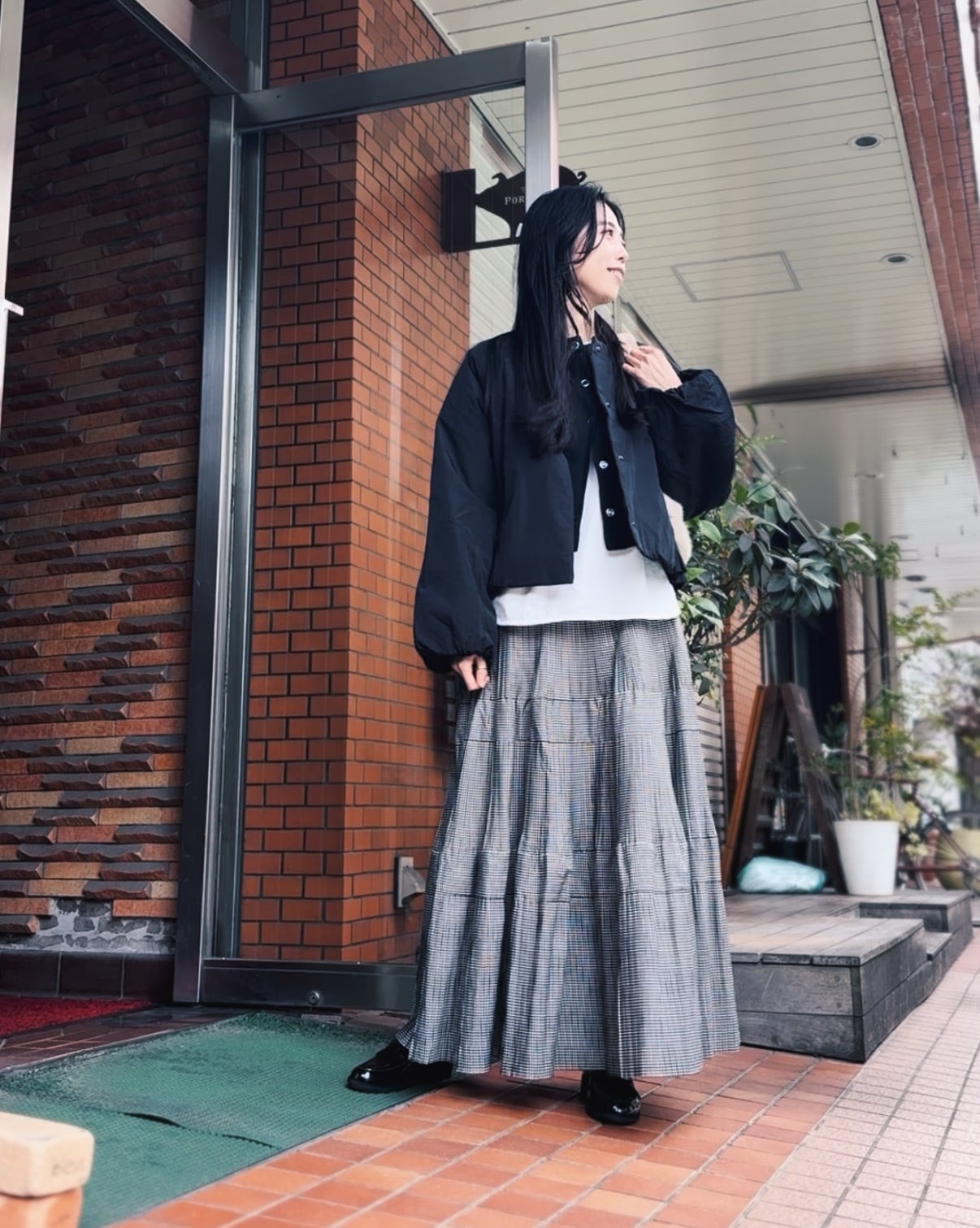 ショート丈なので、スカートやワイドパンツと好バランス。