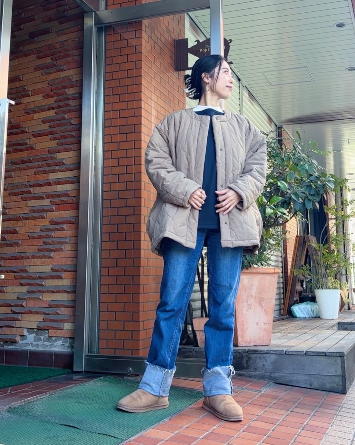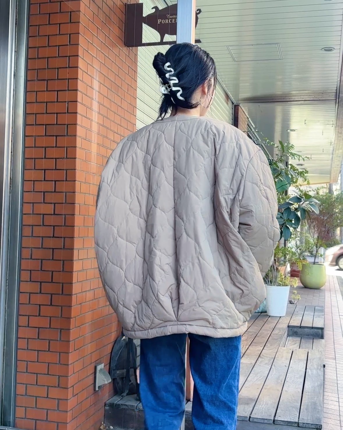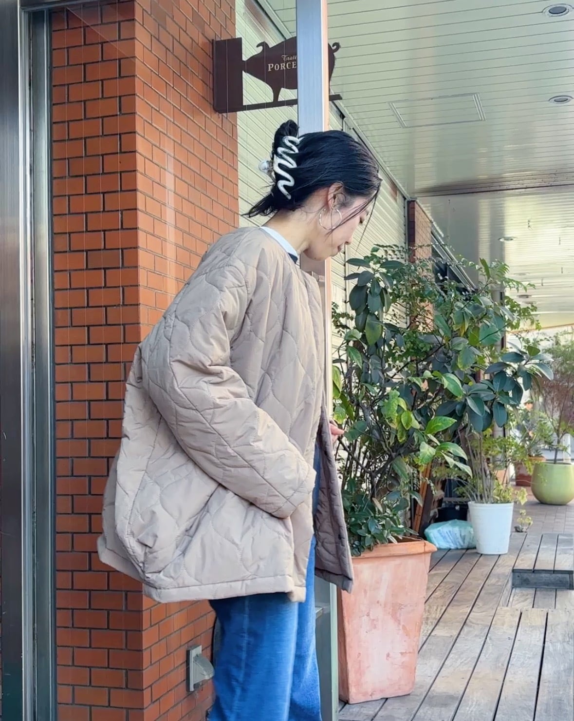 ● 表情のあるふっくらキルティングが、シンプルながらコーデに立体感をプラス。