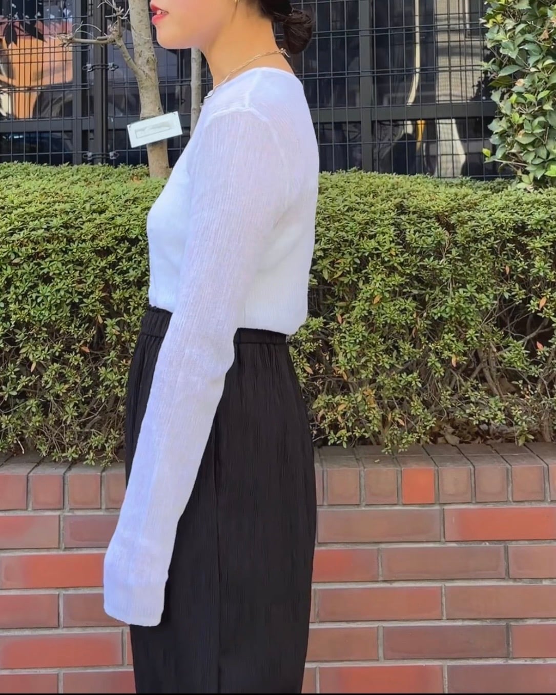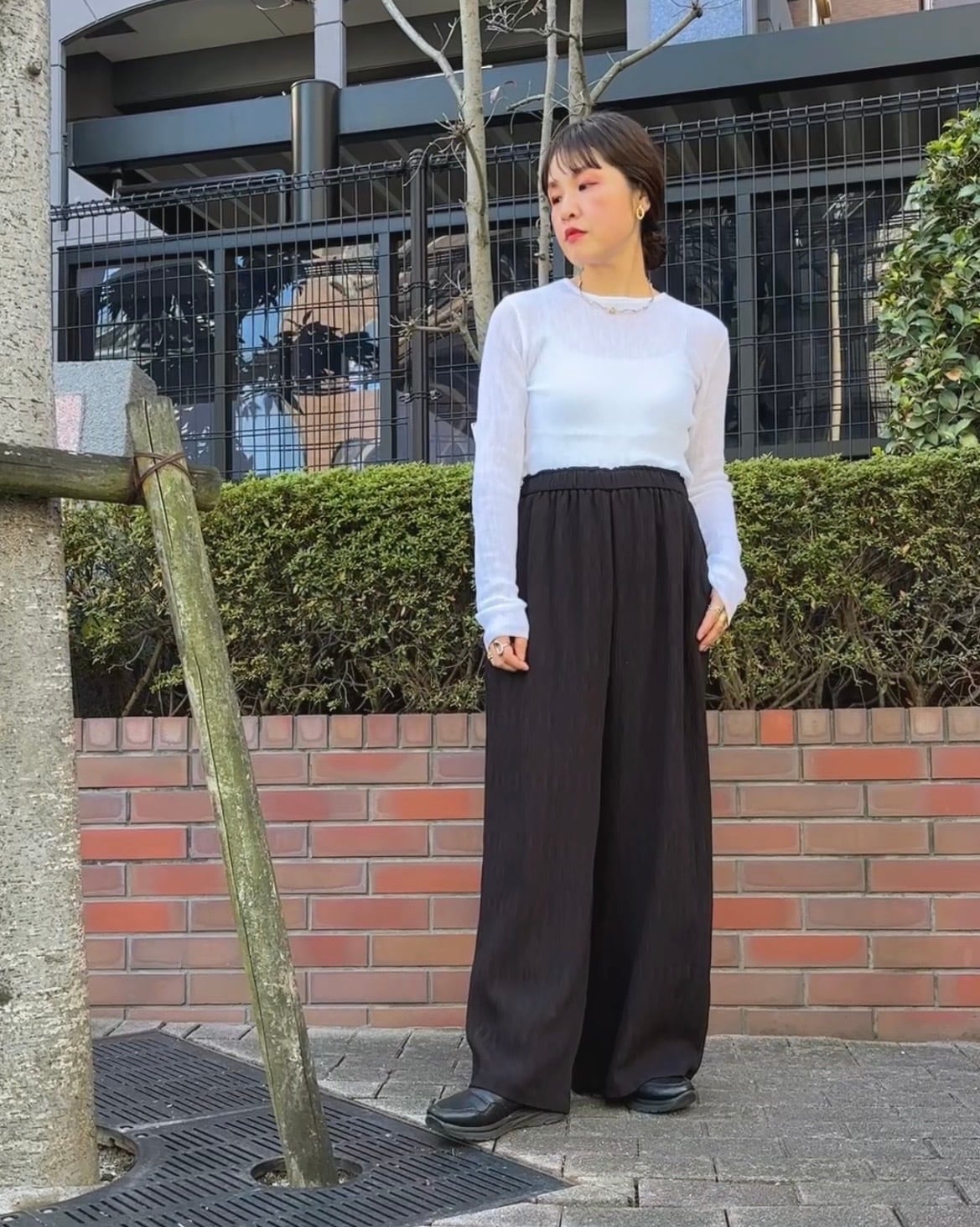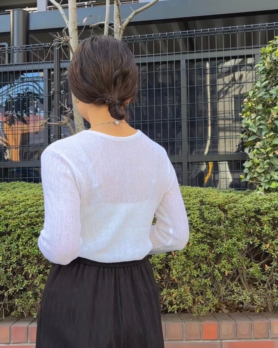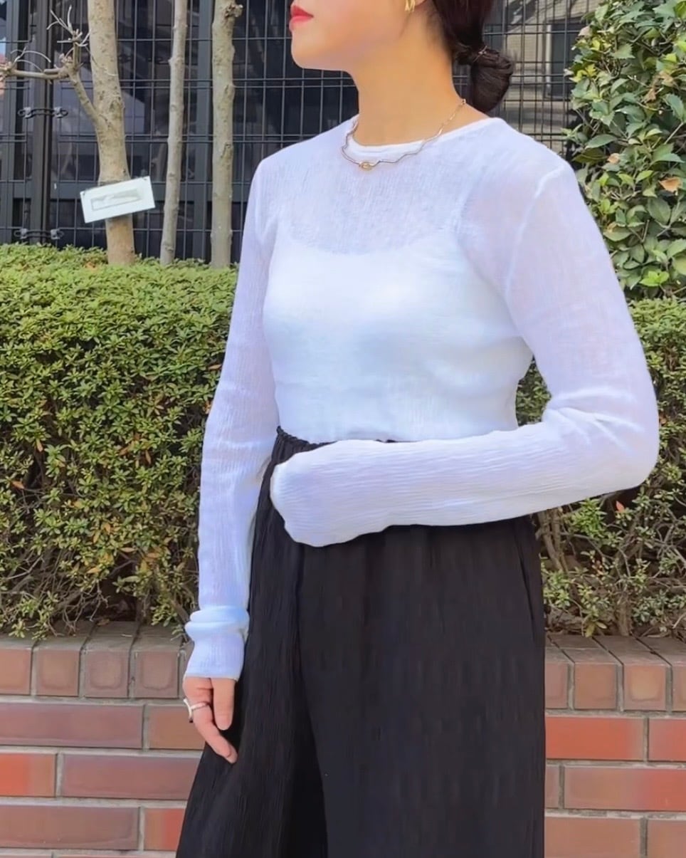 ジャケットやカーディガン、ワンピースのインナーとしても合わせやすく、スタイリングに抜け感と軽さをプラスしてくれます。