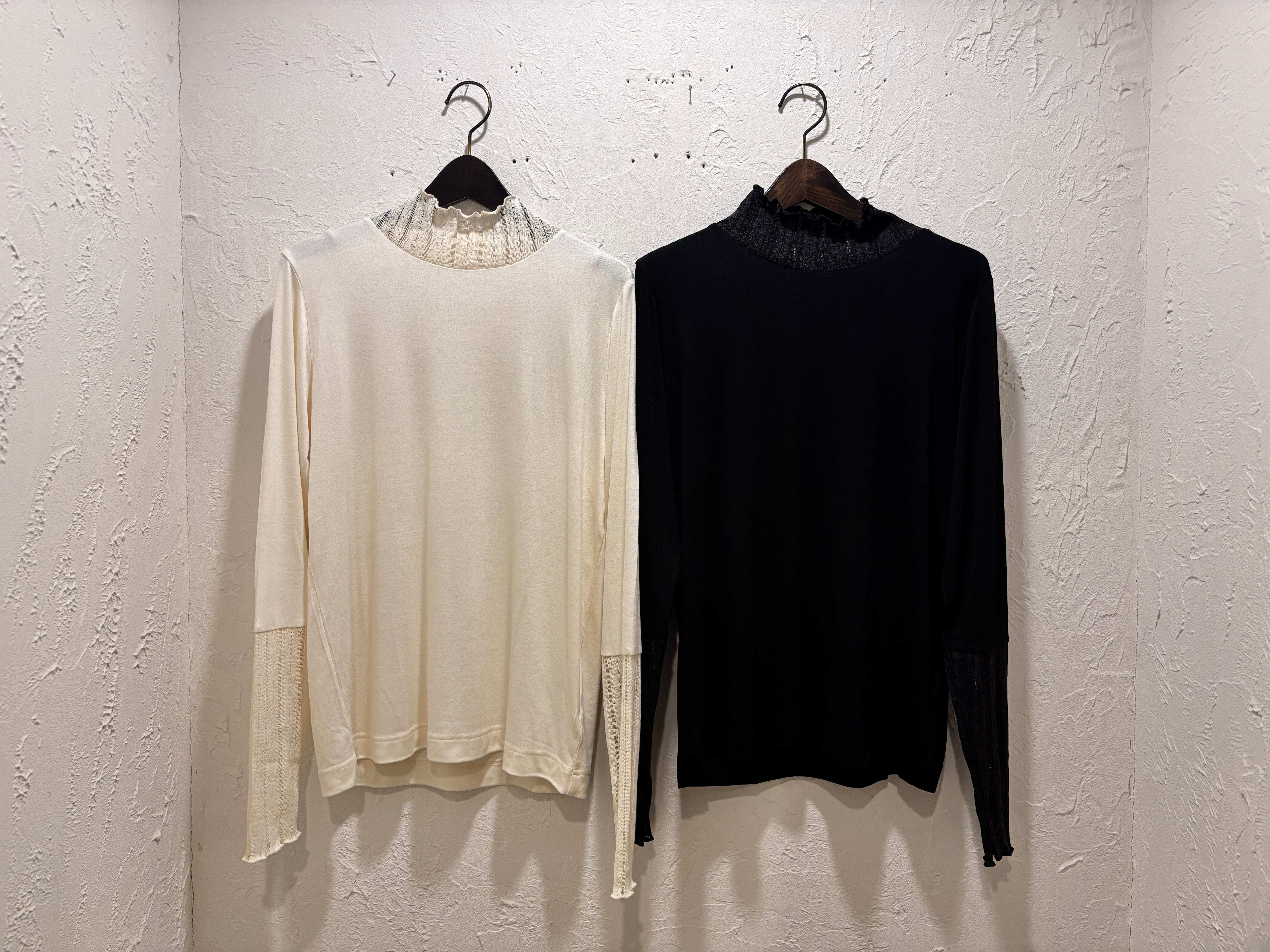 袖口と衿元にはさりげない表情のあるリブ切替を施し、レイヤードした時にもポイントになる一枚。