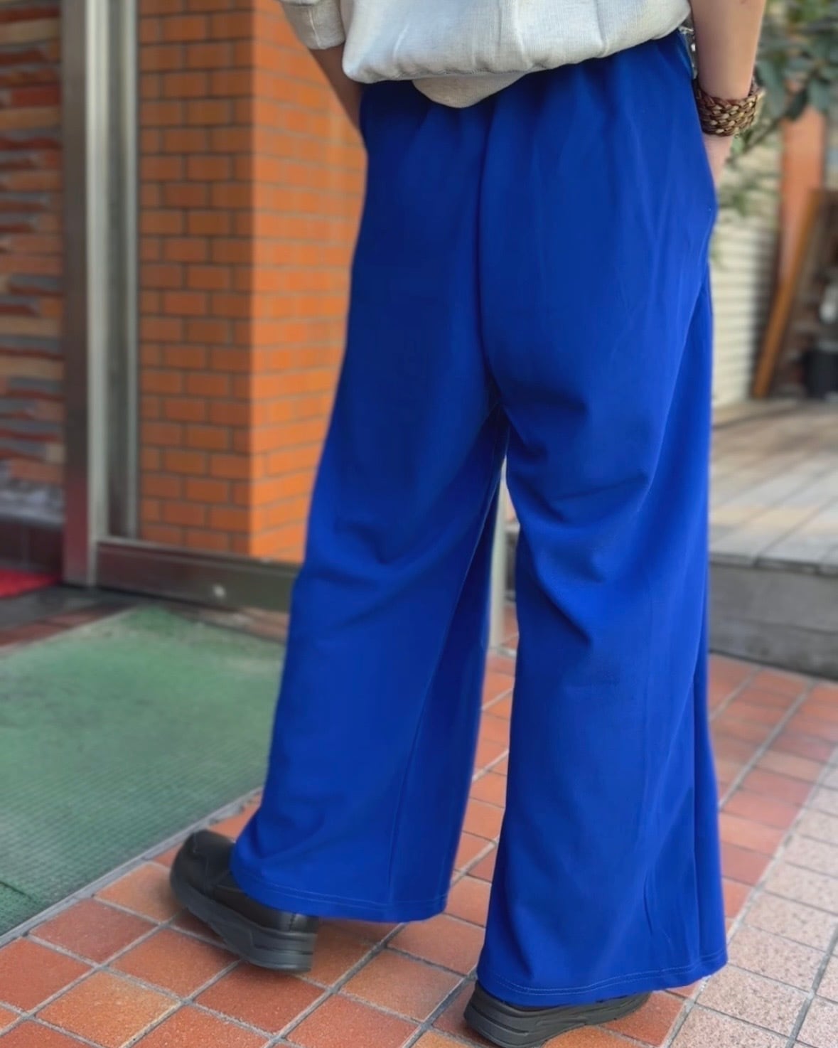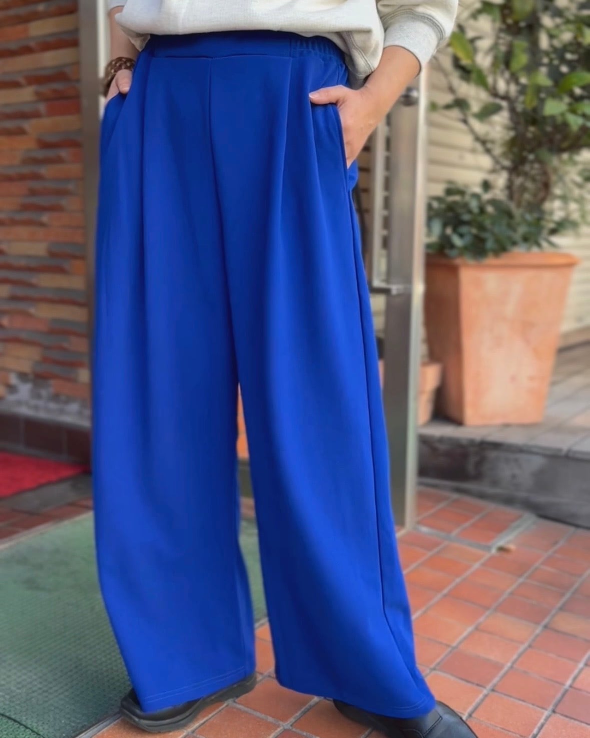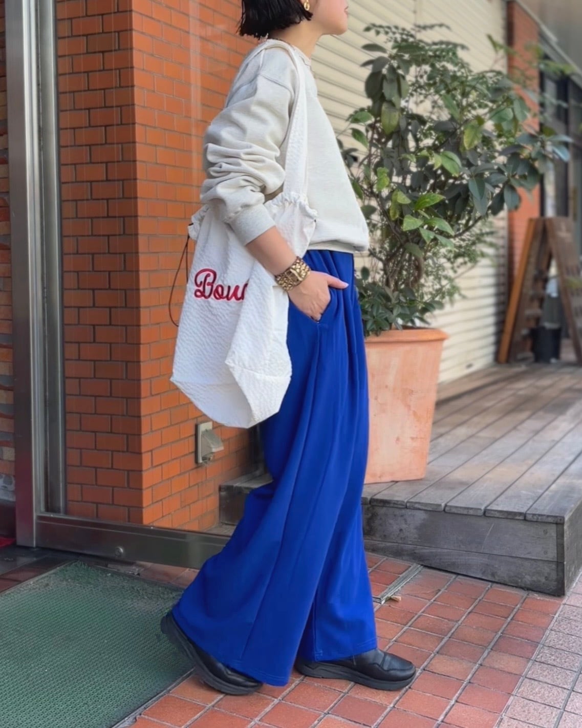 落ち感のある素材で、すとんときれいなシルエットが魅力のワイドパンツ。