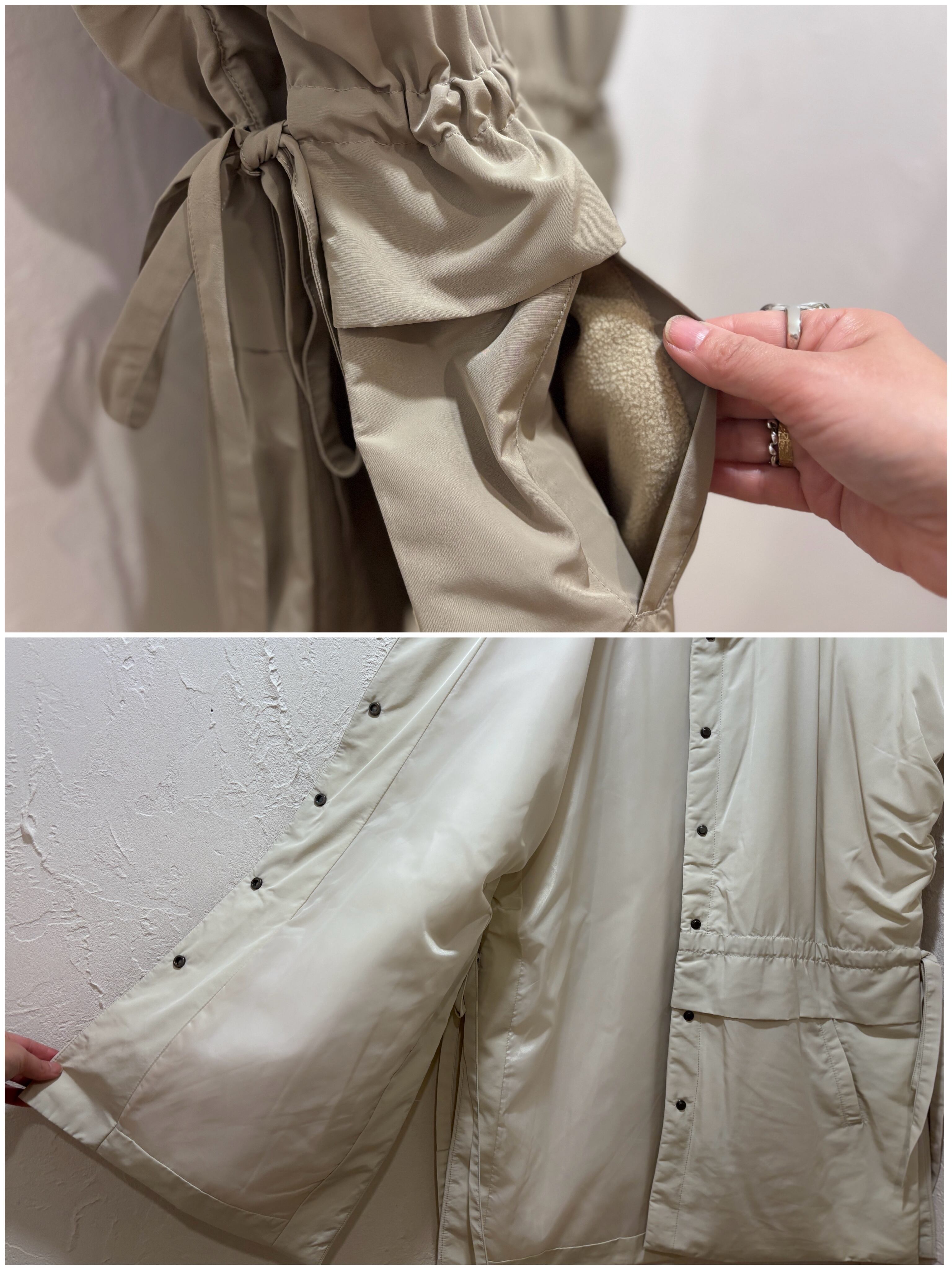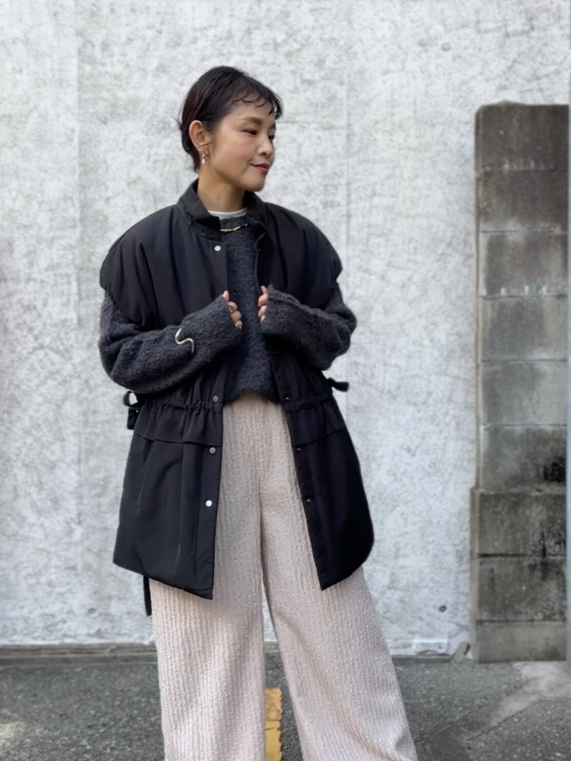 コートの上からも羽織れるオーバーサイズはサイドのリボンでシルエット・サイズ感の調節が出来ます。
