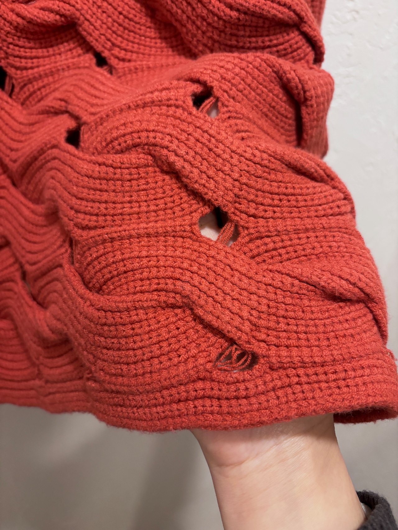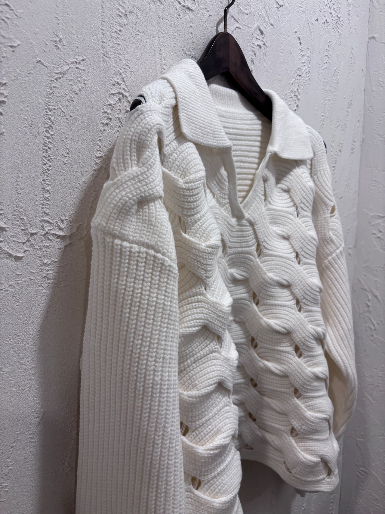 立体感とケーブル編みがシンプルながらも個性的な印象を与えるケーブルポロ。